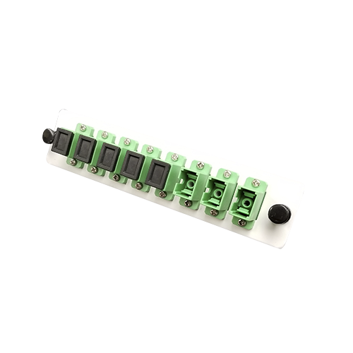 El módulo viene pre-cargado con 8 adaptadores SC Simplex (8 núcleos o fibras individuales). Los adaptadores son de tipo Monomodo (Single-Mode) y están equipados con pulido APC (Angled Physical Contact), que es crucial para minimizar la pérdida de retorno (RL) en la red. El color Verde es el estándar de la industria para identificar las conexiones Monomodo APC, comúnmente usadas en redes GPON y servicios de video de alta precisión. El formato Simplex permite la gestión de fibras individuales de forma independiente.
