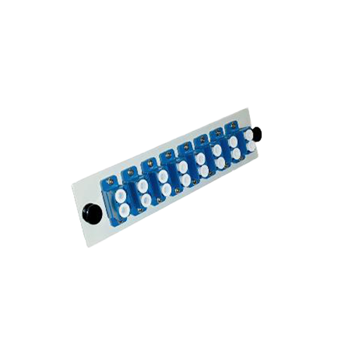 El panel viene pre-cargado con 6 adaptadores LC Cuádruplex, lo que permite la terminación de un total de 24 fibras Simplex en un solo módulo (Cuádruplex = 4 fibras por puerto, 6 adaptadores x 4 = 24 hilos). Los adaptadores son de tipo Monomodo (Single-Mode) y cuentan con pulido UPC (Ultra Physical Contact). Esto se identifica por el color Azul del cuerpo de los adaptadores, el estándar para las conexiones Monomodo UPC. El formato LC (Lucent Connector) es la clave para esta densidad, siendo ideal para backbones de centros de datos y cuartos de telecomunicaciones.