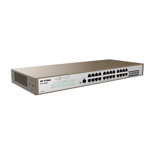Un switch de alta densidad que ofrece VEINTICUATRO conexiones GIGABIT y cuatro puertos SFP para fibra. Su integración con la plataforma IP-COM PROFI lo convierte en la elección ideal para redes que requieren una gestión Capa 2 unificada y avanzada.