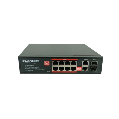 Obtenga la máxima flexibilidad GIGABIT con 8 puertos PoE, 2 Uplinks RJ45 y 2 SFP de fibra en este Switch de 12 puertos.